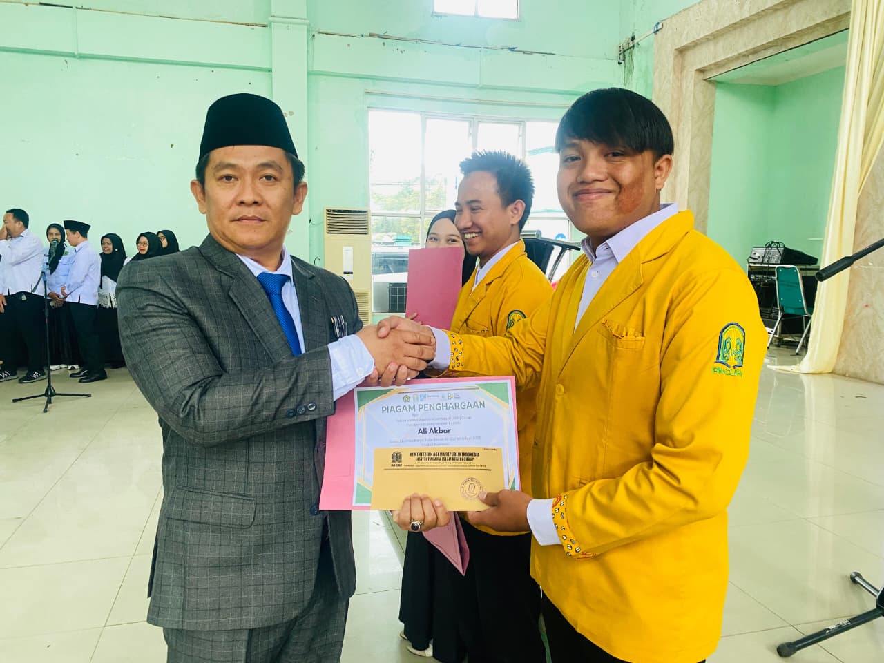 Institut Agama Islam Negeri (IAIN) Curup kembali mencatat prestasi membanggakan. Ali Akbar, mahasiswa Program Studi Ilmu Al-Qur’an dan Tafsir, berhasil meraih juara 3 pada Lomba Karya Tulis Ilmiah Al-Qur’an Tahun 2025 Tingkat Nasional. Prestasi ini mendapat penghargaan langsung dari Rektor IAIN Curup, Prof. Dr. Idi Warsah, M.Pd.I., di Aula Rektorat kampus.