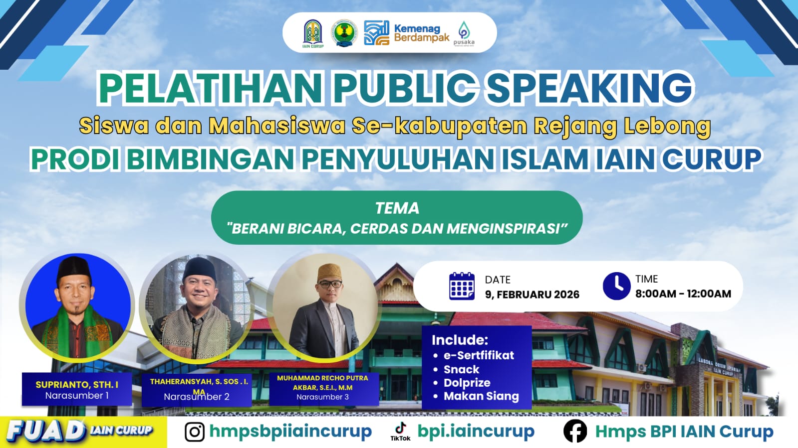 Curup – Program Studi Bimbingan dan Penyuluhan Islam (BPI) Fakultas Ushuluddin, Adab, dan Dakwah (FUAD) IAIN Curup menyelenggarakan kegiatan Pelatihan Public Speaking bagi siswa dan mahasiswa se-Kabupaten Rejang Lebong. Kegiatan ini dilaksanakan pada Senin, 9 Februari 2026, mulai pukul 08.00 WIB hingga selesai, bertempat di Aula Perpustakaan Harun Ar-Rasyid IAIN Curup.